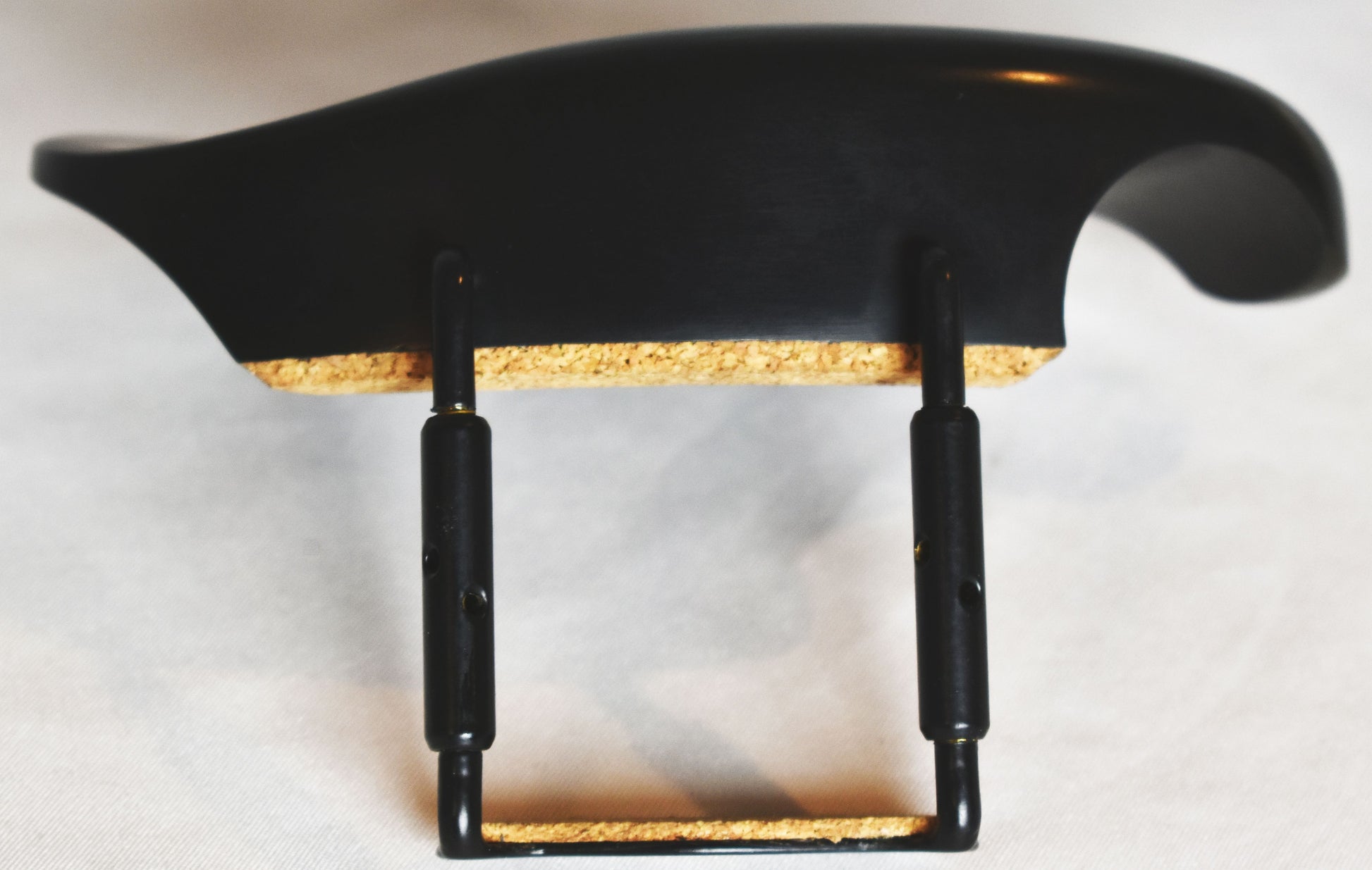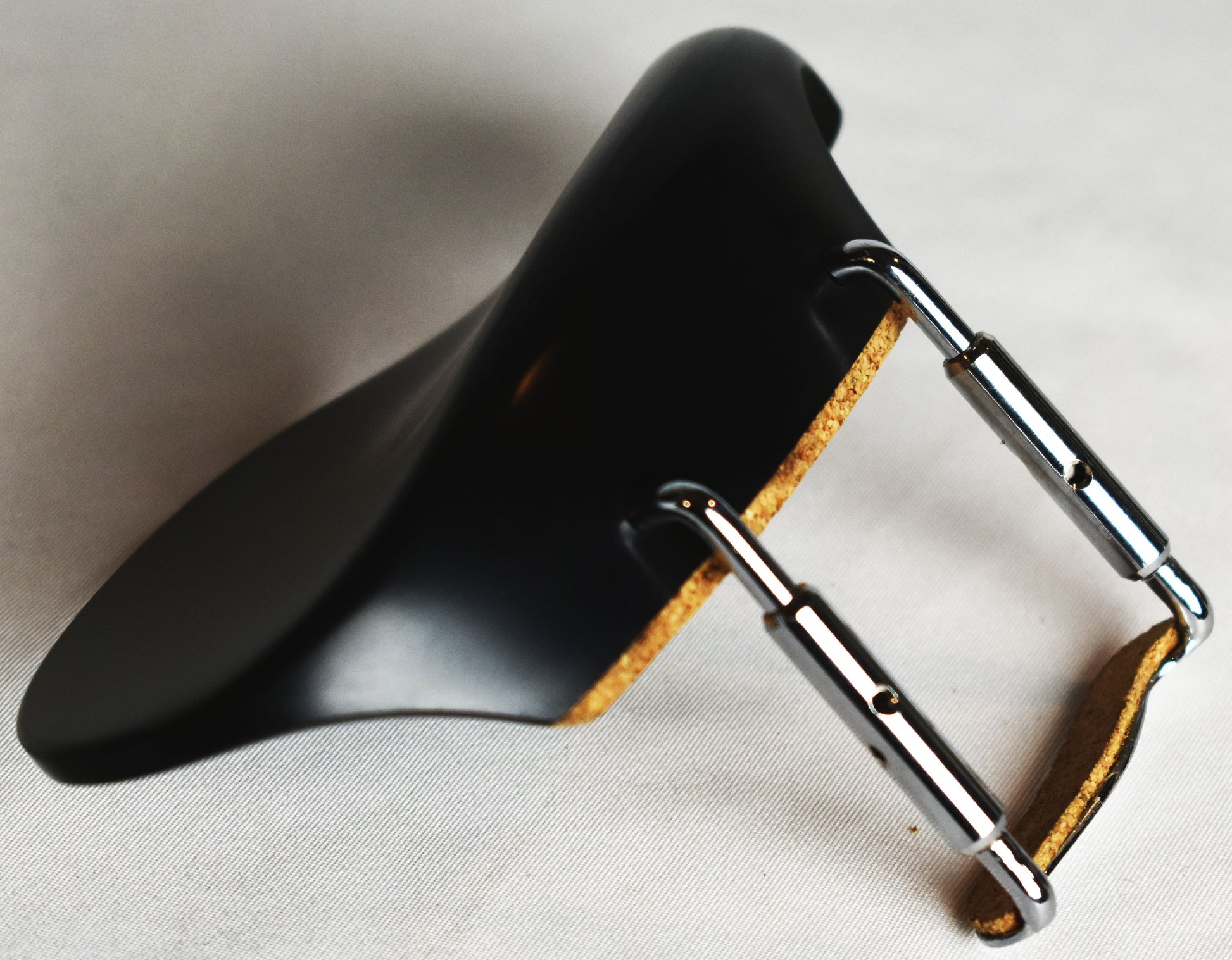 The Nero material is made in the USA from eucalyptus paper and thermosetting resins. It is pure black and mimics the finest Madagascar ebony. It is hypoallergenic and not susceptible to humidity or temperature change. The surface is impermeable to sweat and body fluids and therefore very easy to clean. The cork (Quercus suber) is the finest quality, fitted precisely to minimize acoustic interference and to maximize stability. The hardware is all individually fitted by hand and are straight and thread easily. The Black brackets have the advantage of being less likely to produce sensitivity reactions for those players with nickel allergies compared to chrome brackets. There are no chinrests available that are superior.