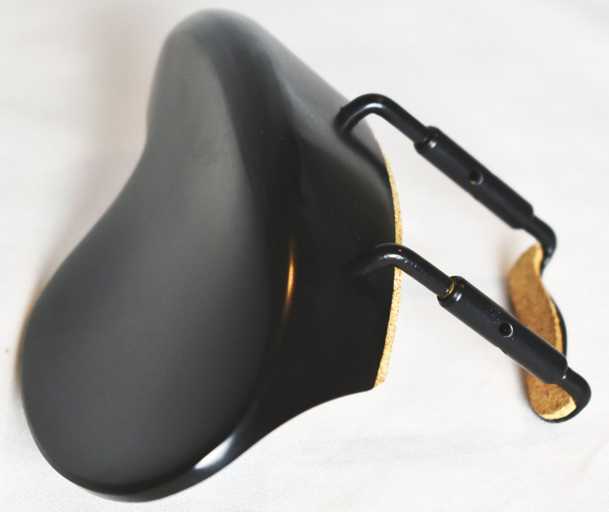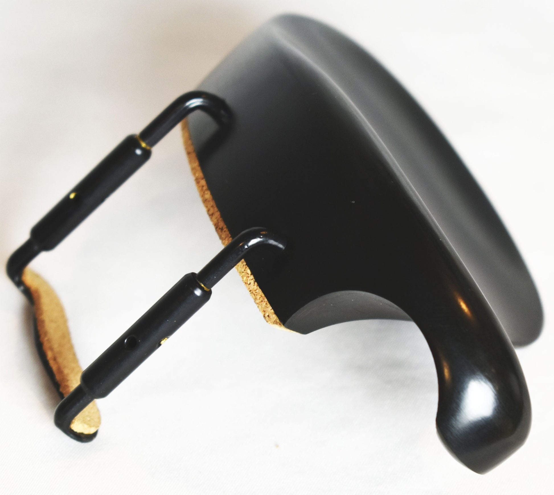 The Hollywood chinrest is a rarely found and very comfortable side mounted chinrest that extends over the tailpiece with a raised hump. At the highest point the chinrest stands 28 mm cup above the surface of the top, and the arch underneath the chinrest has been engineered to clear most peaked tailpieces. It is both comfortable and gives the player outstanding effortless leverage.